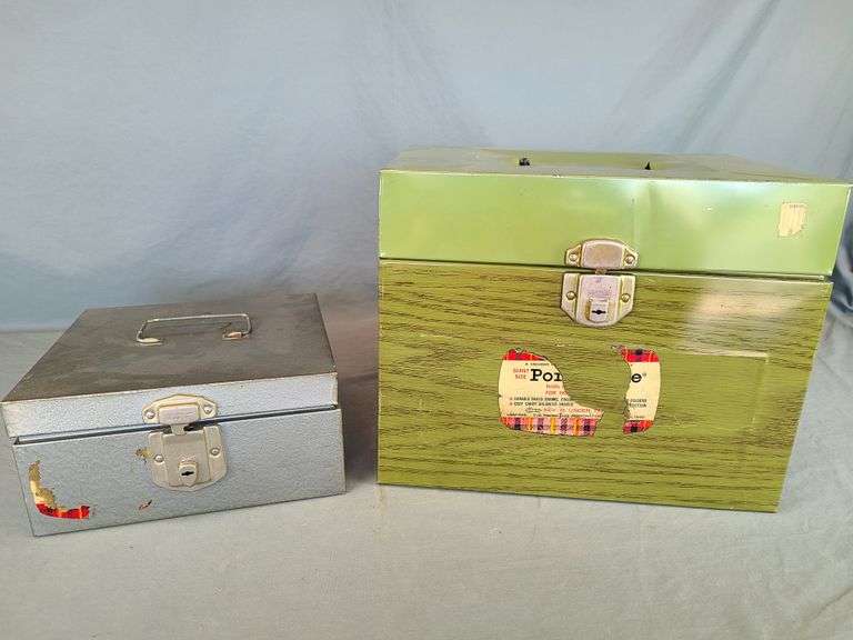 Assortment of Money Boxes: Fire Proof Lock Box, Portable Metal Folder Container, Metal Change Box, & other plastic containers