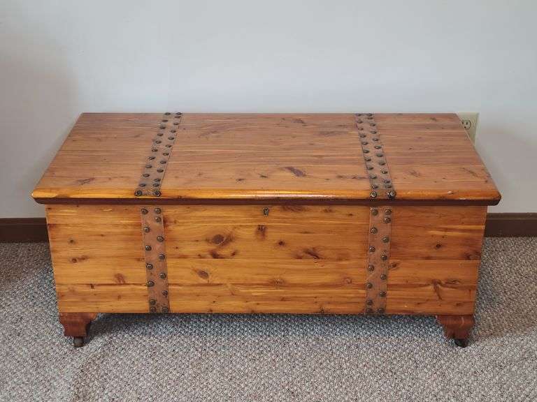 Cedar Chest made by Hill-Hoel Mfg. Co., Red Cedar Chest from South Bend, Indiana, measures approx. 42"Long x 20"Deep x 18"Tall on castors, it has copper bands across the chest