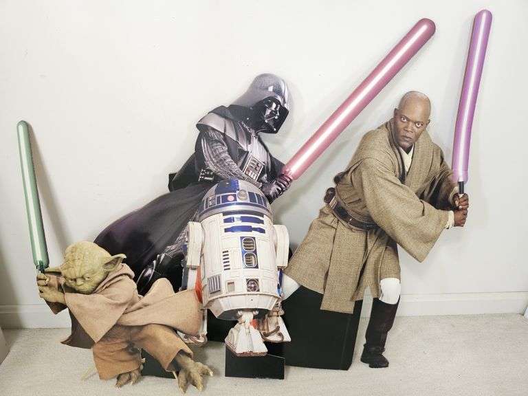 Includes 4 cardboard stand-ups, Darth Vader, Yoda, R2-D2 and Mace Windu. Darth Vader and Mace Windu are two sided. The tallest, Mace Windu is approximately 33" tall. Yoda has a crease at the light saber handle.
