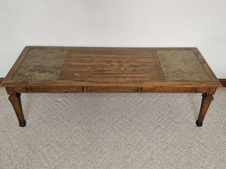Coffee table is approximately 4 feet 4 inches long. And includes 2 marble inserts for the top. End table is 6 sided with one door and approximately 18 1/2" x 16".