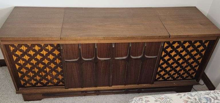 Vintage electrophonic stereo system. With AM/FM receiver, guitar input, turn table, 8nd 8 Track player. Also includes Elvis Presley Aloha from Hawaii 8 Track tape and several 33, 45 and 78 rpm records. Console is approximately 5' long. One sliding do