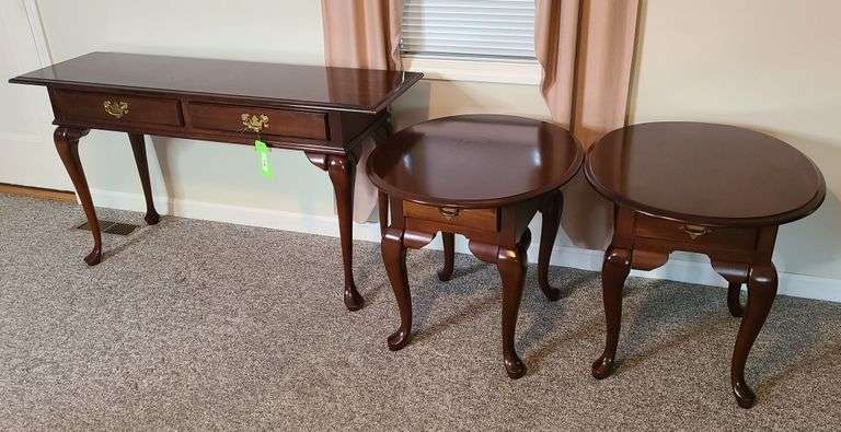Sofa Table measures 52"x16" w/ drawers, 2 matching end tables w/ drawers, cherry color