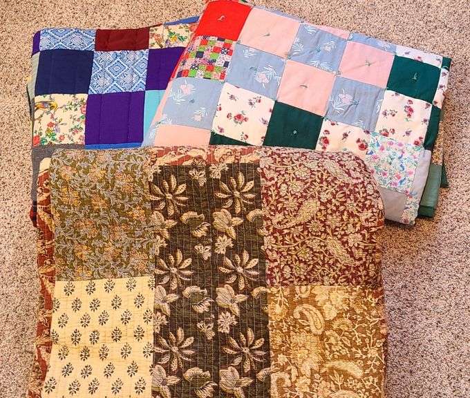 Brown store bought Breadspread measures 100"90", One Comforter is tacked and measures 80"x56", One Comforter is machine quilted and measures 74"x68"