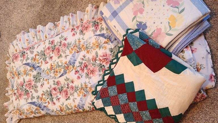 Large Lot of Bedspreads: Purple measures 110"x100", has 2 matching pillows; Yellow measures 86"x68", has pillowcase; floral measures 100"61", has skirt; dark green measures 80"x80", has 2 pillowcases; matching blue & pink bedspreads measure 80"x70" e