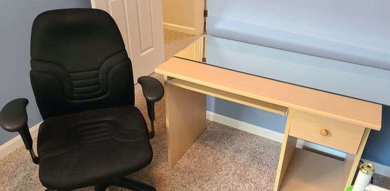 Computer Desk w/ sliding ledge for keyboard, side drawer and lower storage space, desk measures 42" wide; Computer Desk Chair on rollers; Mirror measures 56"x16"