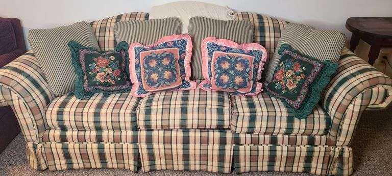 7' Broyhill Couch w/ plaid design, 4 striped throw pillows, 4 floral pillows, cream afghan