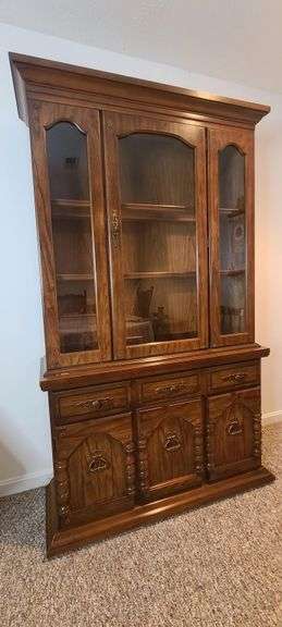 Lenoir House glass-front Hutch w/ Buffet, on buffet one large drawer & 2 doors below that open to shelving, 1 glass door opens to shelving on hutch