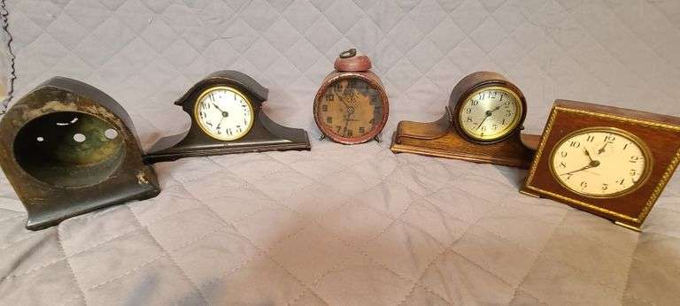 Seth Thomas "Severn" Alarm Clock measures 4"x3 1/2", Small Seth Thomas 8-Day Mantle Clock 8 1/2"x4", Small Mantle Clock (unknown maker) measures 8"x4", Commodore Alarm Clock, various keys and Clock Weights