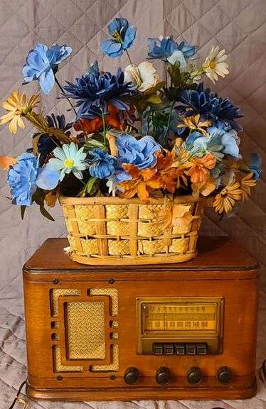 Vintage American Silvertone Radio Model 1561, radio has a floral arrangement on top which we did not remove