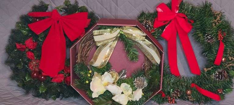 LOT 813 - Christmas Wreaths & 2 Vintage Santa Head Decor