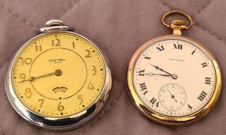 Vintage Sentinel CLICK Pocket Watch Ingraham; Vintage Waltham Pocket Watch w/ initials engraved on the back, possibly DEE, Roman numerals, seconds subdial, Waltham is 17 jewels, Ser. #23204996, neither watch is working