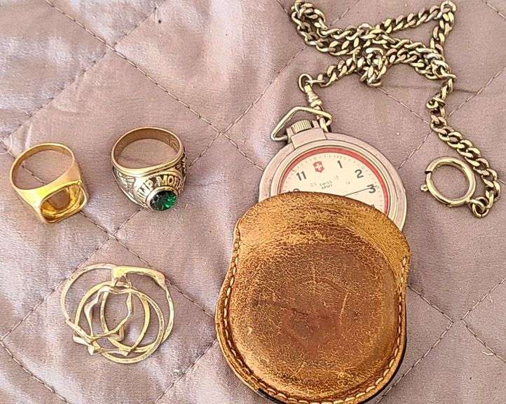 Vintage Swiss Army Watch w/ chain & leather pouch; Vintage Philip Morris Service Award Ring w/ Green Stone, made by Josten's; IGI 10K Gold Man's Ring w/ no stone; Silver Stackable Ring w/ 4 rings, one is broken