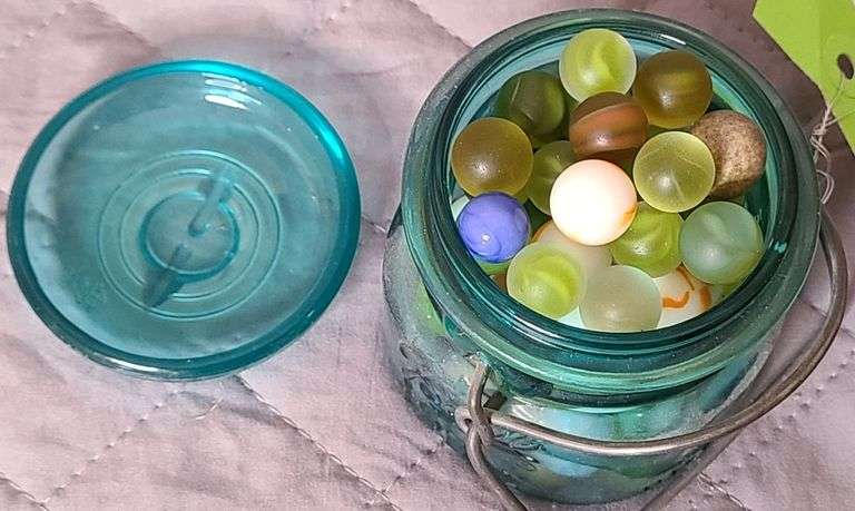 Vintage Marbles in a vintage Blue Ball Jar w/ wire & lid, #77 A10 on jar
