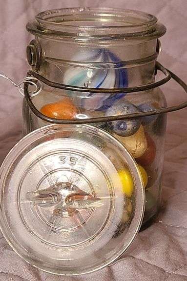 Vintage Marbles in a vintage #1035 Drey Jar w/ wire, some large marbles