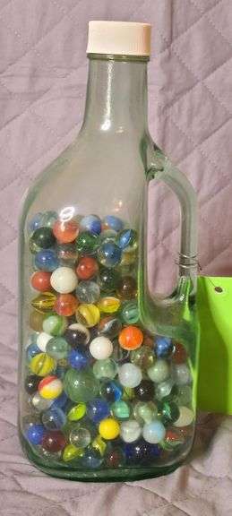 Vintage Marbles in a vintage green bottle w/ handle & lid, some large marbles, info. on bottom of jar I, D230, D20, 87