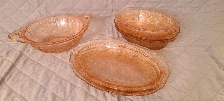 Lot of Vintage Cherry Blossom Pink Depression Glassware: Divided Oval Platter, 3 Oval Bowls, Bowl w/ handles, 2 Oval Plates, Round divided Platter, Cake Platter on 3 legs, 4 Round Plates w/ handles