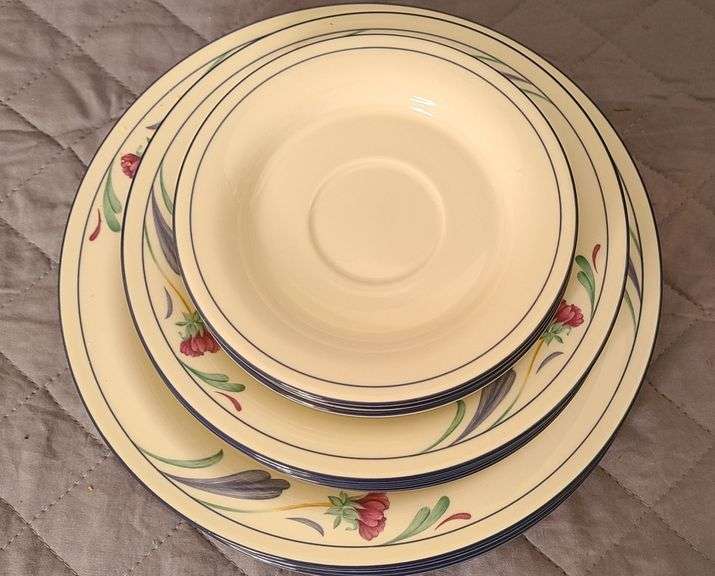 Lenox China Stone Poppies on Blue design, 1 Platter, 3 coffee cups, 3 saucers, 1 large serving bowl, 5 cereal bowls (1 w/ chip), 6 dinner plates, 6 salad plates
