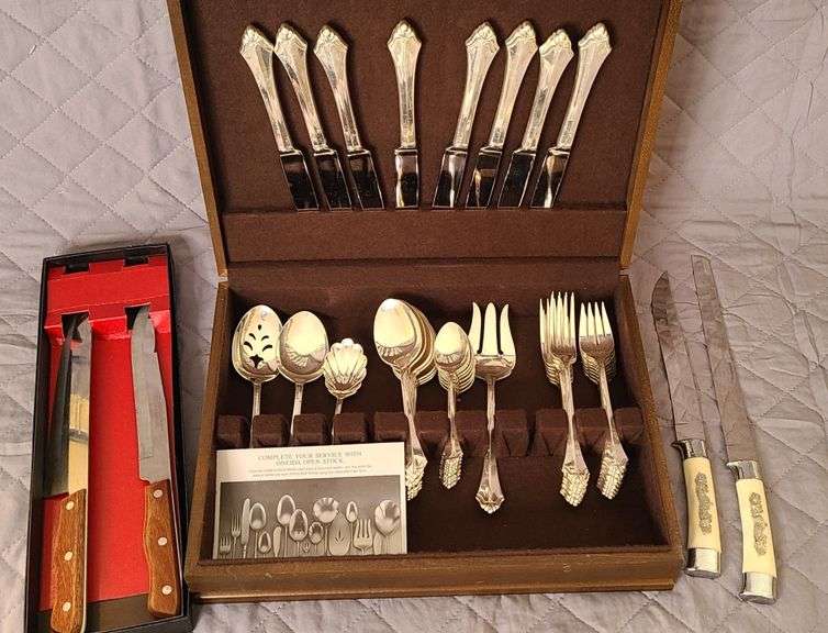 Flatware Storage Box w/ 8 place setting of Oneida Belcourt design flatware; Vintage Armack 2 knives w/ cream handles & silver embellishments; Maxam Precision Hollow Ground Fine Stainless Steel 2 pc. Knife Set