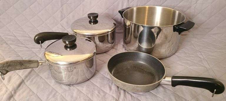 Lot of Cookware: Vintage Revere Ware 2 Qt. & 1 1/2 Qt. Pots w/ lids, NEW 20 Qt. Metro Stock Pot w/ lid, stainless steel; small pan, 6 Qt., no lid