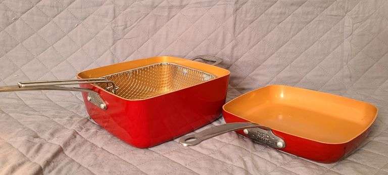 2 Red Copper Skillets w/ 1 lid, Tramontina Skillet, Fry Basket & other misc. items