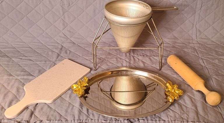 Lot includes metal colander w/ pestle, many RADA knives, sifter, racks, batter dispenser, salt & peppers, and more