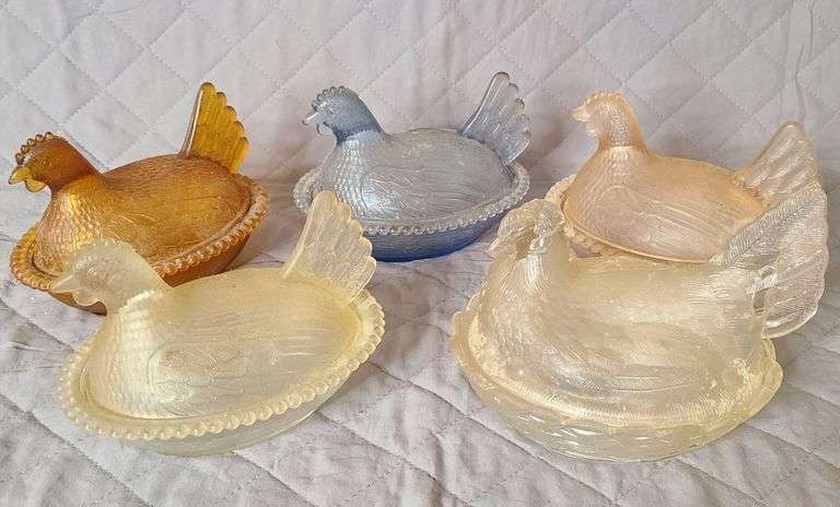 Vintage Hens on Nests: Indiana Glass, various colors, 1 is split tail