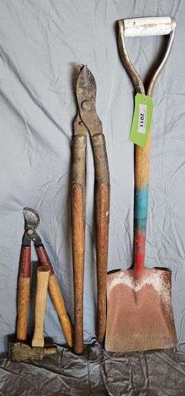 Lot includes flat-end shovel, hatchet, 2 loppers