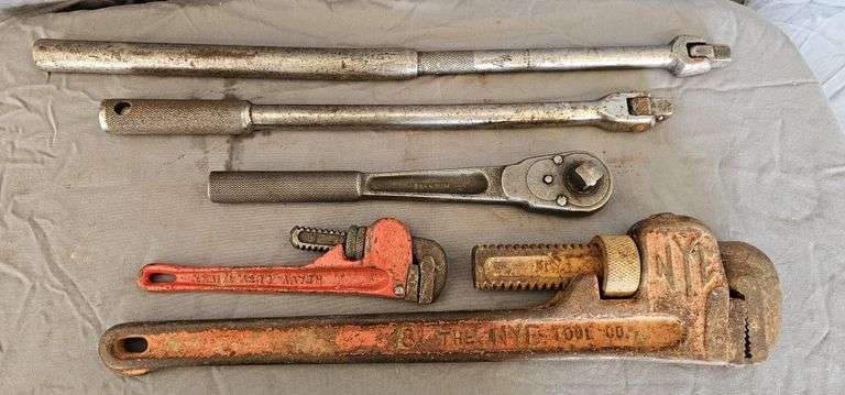 Wrenches (some Craftsman), drives, Skil 12V driver (no battery), and large pipe wrench