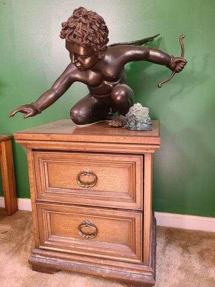 Bronze Crouching Cherub Sculpture by Artist Nishan Toor, measures approx. 23" wide & 15.5" tall, signed; also a small Sean Corner sculpture entitled "Garden Song" & dated 2011 & signed; also includes an end table w/ 2 drawers that it is sitting on