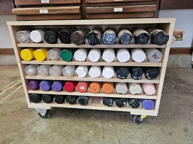 (34' x 17 " x 24") rolling cart wtih slots for 100 spray paint cans, includes some paint