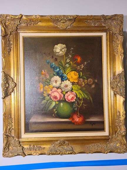 (3) Framed Paintings: Framed painting of Flowers, signed by Taylor, frame measures 30.5"x34.5"; Painting of Snow Scene in the Woods, signed by Winkler, frame measures 32.5"x28.5"; Painting of "Blue Daisies", signed by Barbara Buchanan, frame measures 20"x23"