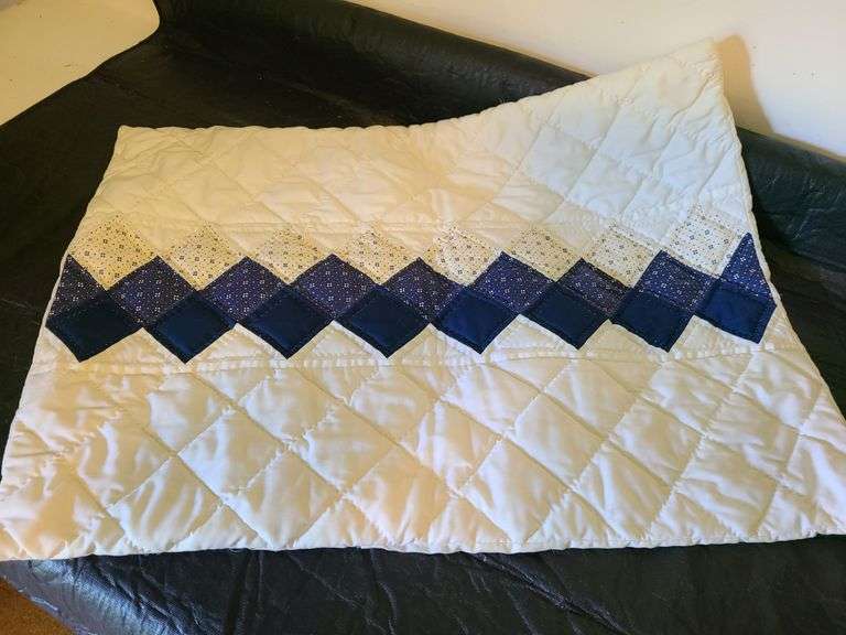 Blue and white Quilted Bedspread measures 90x76. Also has one Quilted Pillowcase