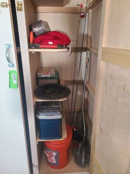 Fishing Equipment includes: (2) Rods & Reels - Shakespeare Excursion Rod w/ Med. Action, 6 ft. w/ Rhino Reel; 5' Zevco Rod w/ Wide Angle Powertrain Drag 404 Reel; Nets; 5 gal. Bucket w/ camping supplies - gloves, toilet paper, etc.; 3 Tackle boxes and one of the is full of knives, hooks, lures, bobbers, & other supplies; Seat Cushion; Fish Cage; Handy Fisherman small pole; Life Jacket; Cammo netting; Extendable Oar, & other items