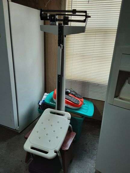 Upright scales, shower chair, blood pressure cuff, tote of supplies.