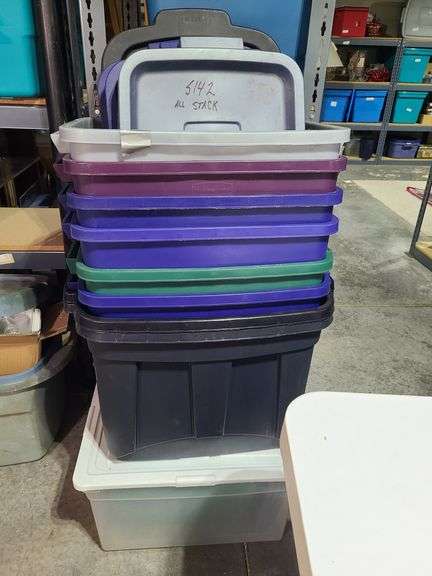 6 Roughneck Rubbermaid, two 18-gallon Rhino-Tuff totes, and other totes, all w/ lids.