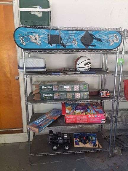 Includes badminton sets, horseshoes, snowboard, golf club, tennis racket, baseball bats, coolers, and more. Shelf is not included.