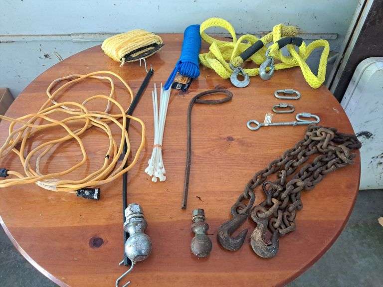 Includes 7 ft log chain with hook on both ends, braided tow rope with hooks, other rope, zip ties, electric extension cord, 2 5/16 inch towing ball, 1 7/8 inch towing ball, and more.