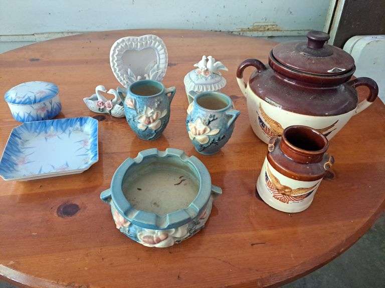 Includes Roseville number 28 ashtray, two Roseville 86 vases (one has small chip), two McCoy pieces (one has worn spot in lid), and other porcelain items.