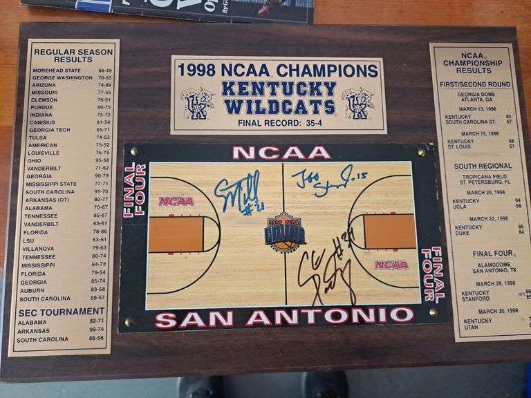 Includes framed poster 26x38. 1998 plaque signed by Scott Padgett, Cameron Mills, and Jeff Sheppard. Five coffee mugs, diecast Chevrolet Nova, pennants, commemorative can, and more. All in a large blue tote.