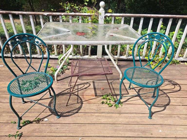 Two green metal chairs, brown metal table, and glass top table measuring 32x54.